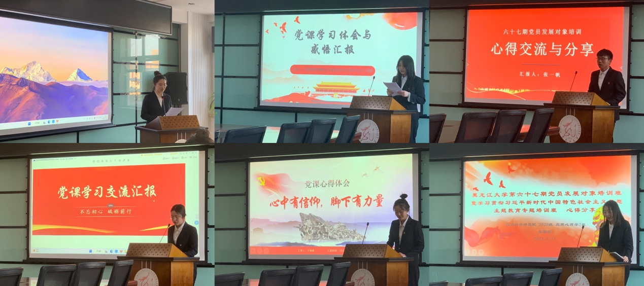 文学院党员发展对象代表于静远、易冉莹进行分享,通过把学习党章与学习党的二十大精神有机结合起来,加深了对中国共产党的认识,更加坚定地听党话、跟党走,不负韶华,努力成为堪当大任的时代青年。政府管理学院党员发展对象代表于佩淼、丁若晴带领大家回顾第六十七期党员发展对象专题党课的主要内容,结合自身实际,号召大家主动学习党的创新理论,充分发挥榜样引领作用。最后,教育科学研究院党员发展对象代表张一帆、姜雨非结合学习《习近平新时代中国特色社会主义思想专题摘编》、情景研学、志愿服务等活动分享学习心得,表示在未来的学习和生活中保持先锋意识和向上精神,努力成为全面发展的社会主义建设者和接班人。