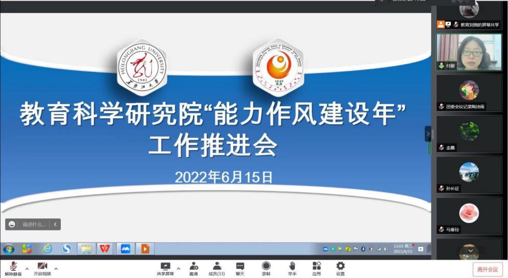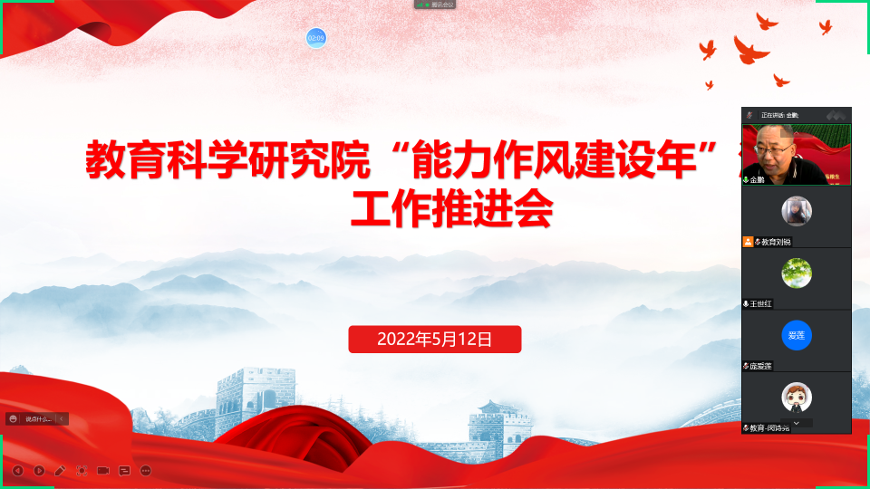 “能力作风建设年”活动实施方案》要求,教育科学研究院于2022年5月12日和6月15日分别召开“能力作风建设年”工作推进会。会议由学院党总支书记金鹏主持,全院教职工参会。