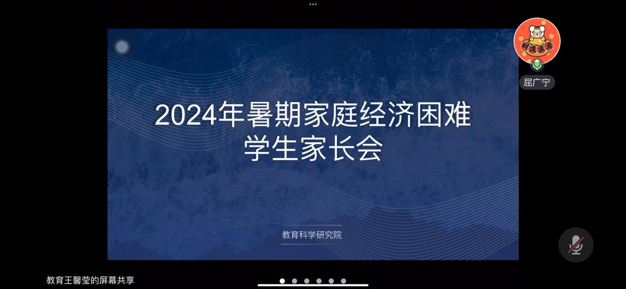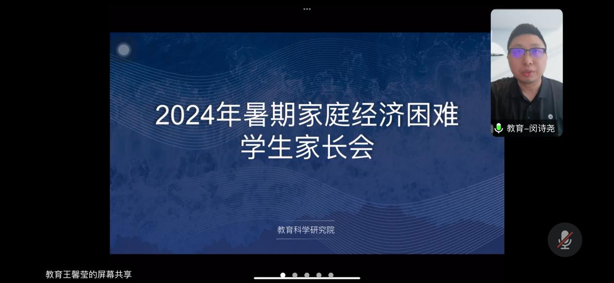 为贯彻落实立德树人根本任务,推进发展型资助育人工作,加大学生资助宣传力度,确保国家资助政策落到实处,更实、更细、更规范、更到位地做好家庭经济困难学生资助工作,增强家校联动工作机制,教育科学研究院于2024年7月召开家庭经济困难学生家长会、进行“云”家访工作。