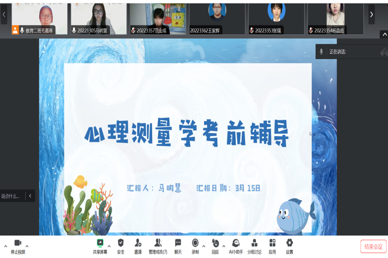 新学期伊始,为进一步强化学院学风建设,改善学生学习状况,帮助参加补缓考的同学查漏补缺,找准备考方向,提高考试通过率,充分发挥优秀学生在学风建设当中的引领示范作用,教育科学研究院于2024年3月15日开展考前辅导活动。本次辅导活动由多位成绩优异的同学对部分同学进行针对性辅导。教育学专业邀请到了罗妍同学,应用心理学专业邀请到了杨志坤同学和马明慧同学进行分享。