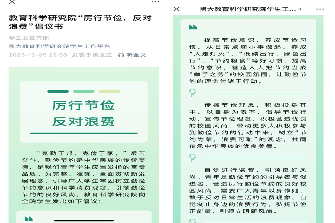 取之有制、用之有节则裕,取之无制、用之不节则乏。为推动节约意识的普及和资源的合理利用,助力我院学子自觉践行勤俭节约的理念,让节俭美德内化于心,外化于行,教育科学研究院面向全院学生提出“厉行节约,反对浪费”倡议,希望同学们以此为契机,践行绿色健康的生活方式,涵养简约文明的饮食文化,使节俭理念深入人心、节约之风见诸行动,为建设资源节约型、环境友好型社会添砖加瓦。