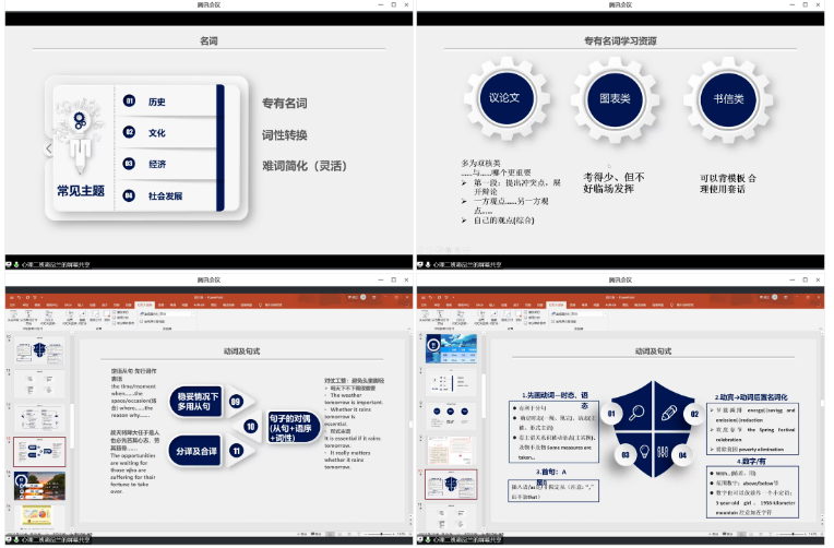 紧接着她从审题的三个维度为大家讲述写作类题型,包括了四种常见的体裁类型、六种总体描述的方式、常见的六种涉及主题、两类变化趋势和与字数要求。她表示,作文部分可分为议论文、图表类、书信类、谚语类四大写作类型,写作需要新鲜高级的表达,因此在写作过程中则应熟练运用各大从句,虚拟语气,强调句,倒装,被动语态等高级句式,把握好整体的结构逻辑,注意卷面的整洁性和布局。她表示写出高质量且赏心悦目的作文,是依靠平时的积累和努力,通过不断练习来提升。