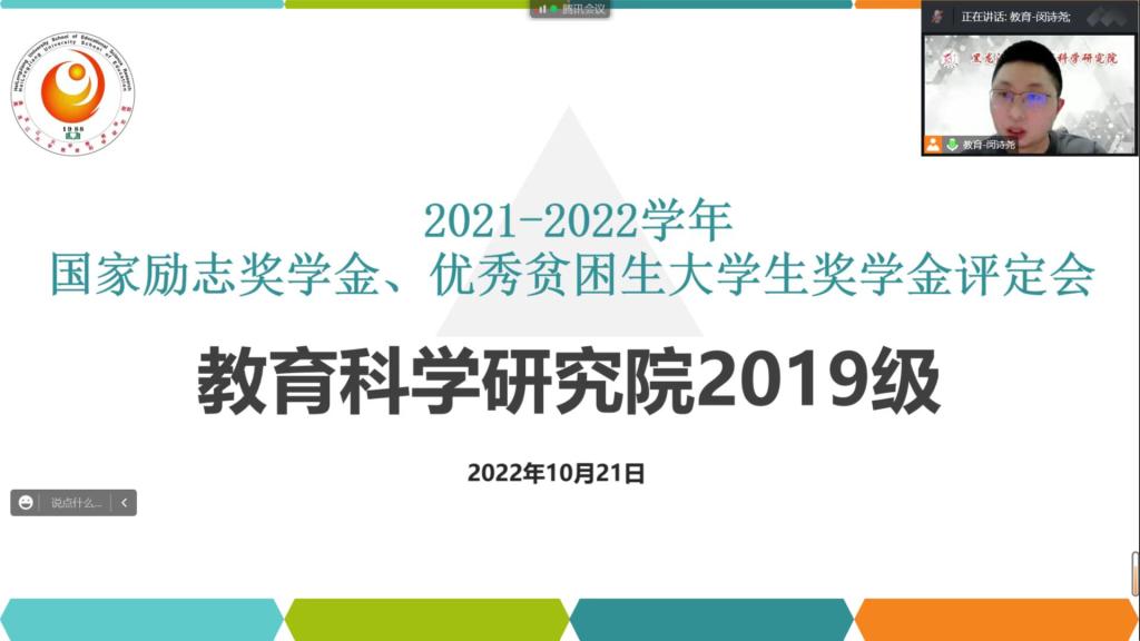 为切实做好学院资助育人工作,保障学生得到有效的资助,根据学生工作部《关于评定2021-2022学年国家励志奖学金的通知》与《关于评定2021-2022学年优秀贫困大学生奖学金的通知》相关要求,教育科学研究院高度重视,成立以院党总支副书记为组长的认定工作领导小组,各年级于2022年10月21日组织召开国家励志奖学金、优秀贫困大学生奖学金评定会议,由2019-2021级辅导员主持,家庭经济困难学生参加会议。