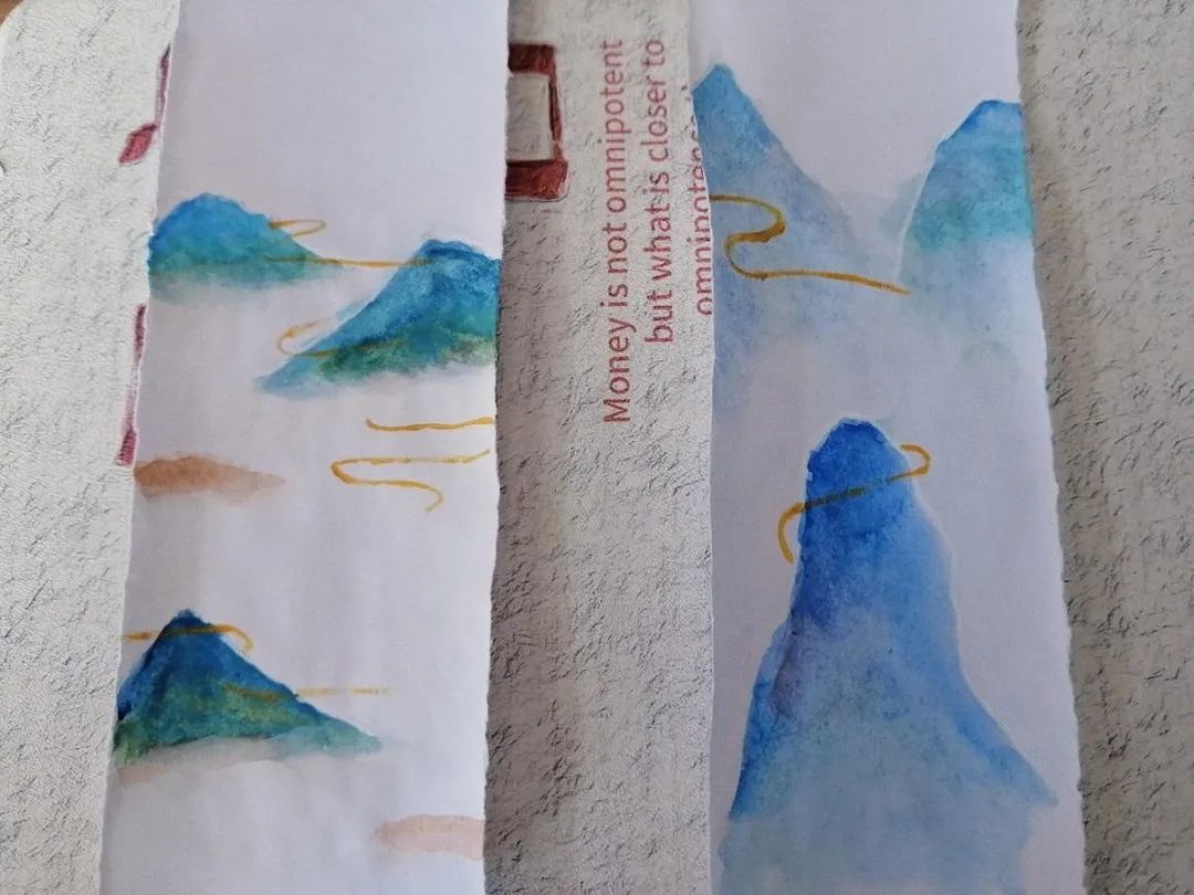 设计理念:书中的世界有山有海,日月星辰,海浪碧波。一山之隔可能是两重世界,所以书中世界也是如此的,所以书签夹在书中,也就像日月间的山海。