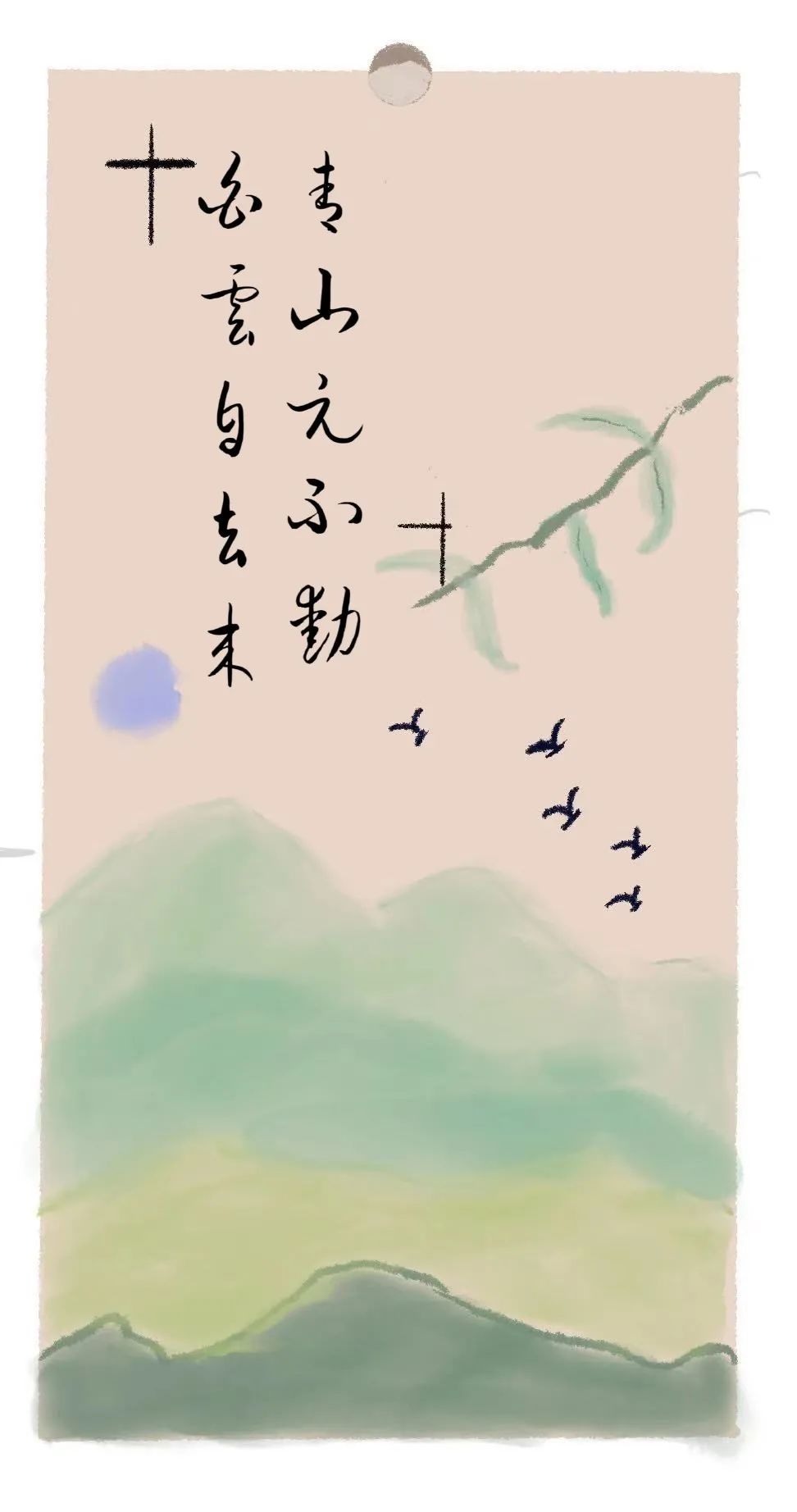 设计理念:“青山元不动,白云自去来。”是林清玄先生的散文《人生最美是清欢》中的一句话。无论你在哪,心境都要保持平和。因为疫情,我们被管控在校园,但不论周遭环境如何变化,书就在那里,知识就在那里,思想就在那里。静下心来,好好读一本书吧。在这个书签中,远处有重山,飞鸟振翅翱翔,对于知识,我们应该如飞鸟一般努力向前追求。
