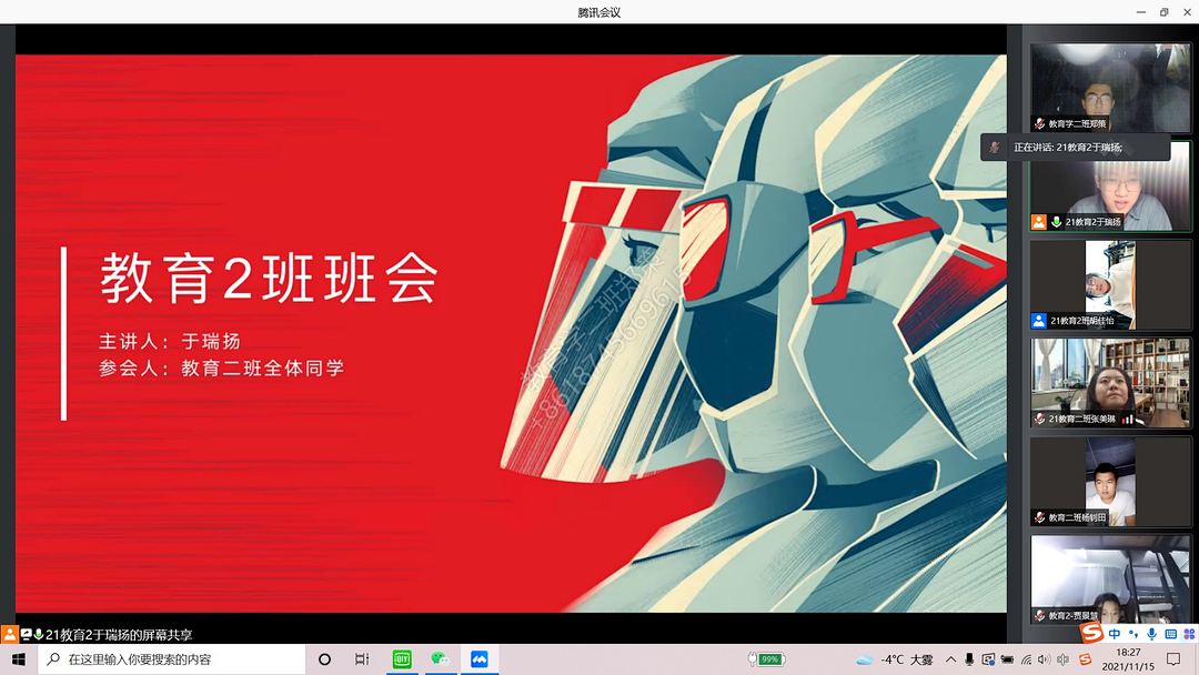为了进一步帮助2021级新生更加科学地规划大学生活,明确学习目的并树立奋斗目标,2021年11月15日18时30分教育科学研究院于腾讯会议平台召开第二次班会,班会由2021级各班班长主持,各班班长、生活委员、学习委员主讲。本次班会共分为三个部分,分别为集体学习《色色视频